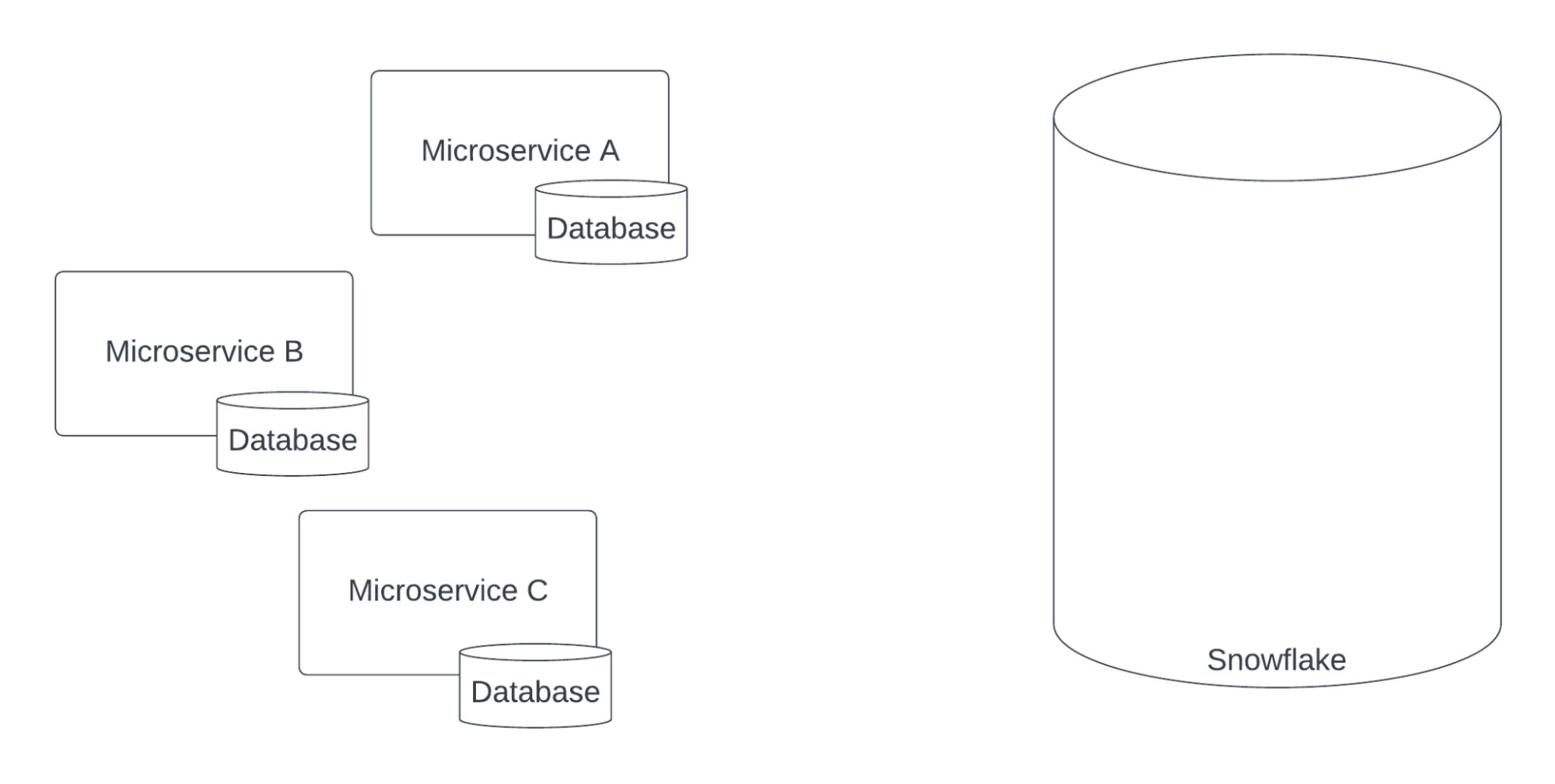 In the past we relied upon an ETL tool (Stitch) to pull data out of microservice databases and into Snowflake. This data would become the main dbt sources used by our report models in BI.